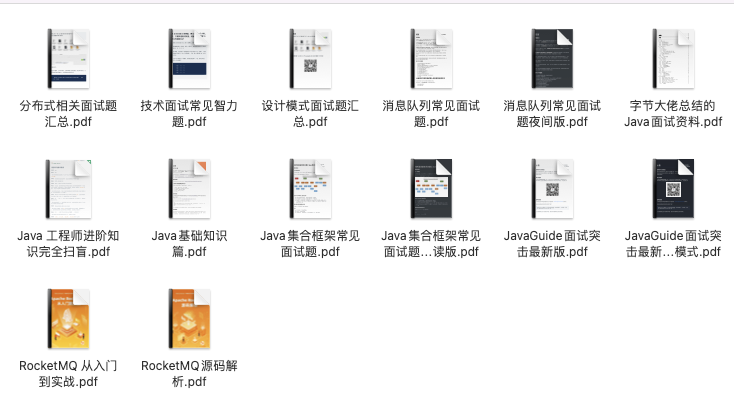 整理汇总了一些 Java 面试相关的高质量 PDF 资料,涵盖 Java 基础、并发、JVM、设计模式、数据库、SpringBoot、分布式、消息队列、智力题……。