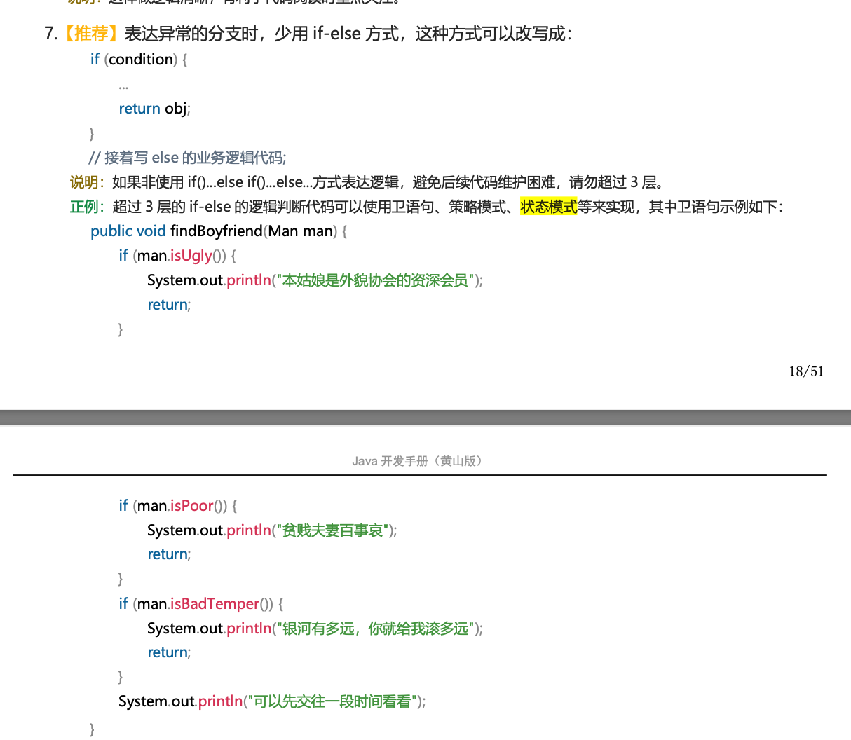 超过3层的 if-else 的逻辑判断代码可以使用卫语句、策略模式、状态模式来实现。