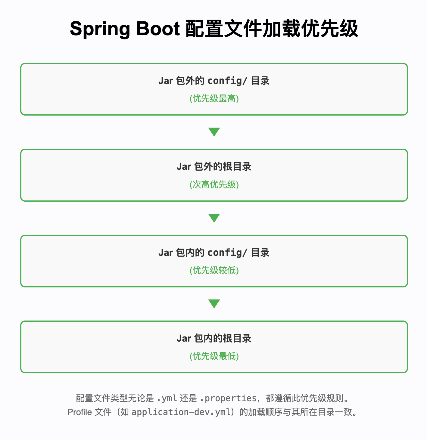 Spring Boot 加载配置文件的优先级设计得非常灵活,主要是为了方便我们在不同环境(开发、测试、生产)下覆盖或指定配置。它的原则是:后加载的覆盖先加载的,而且离用户(或部署环境)越近的优先级越高。